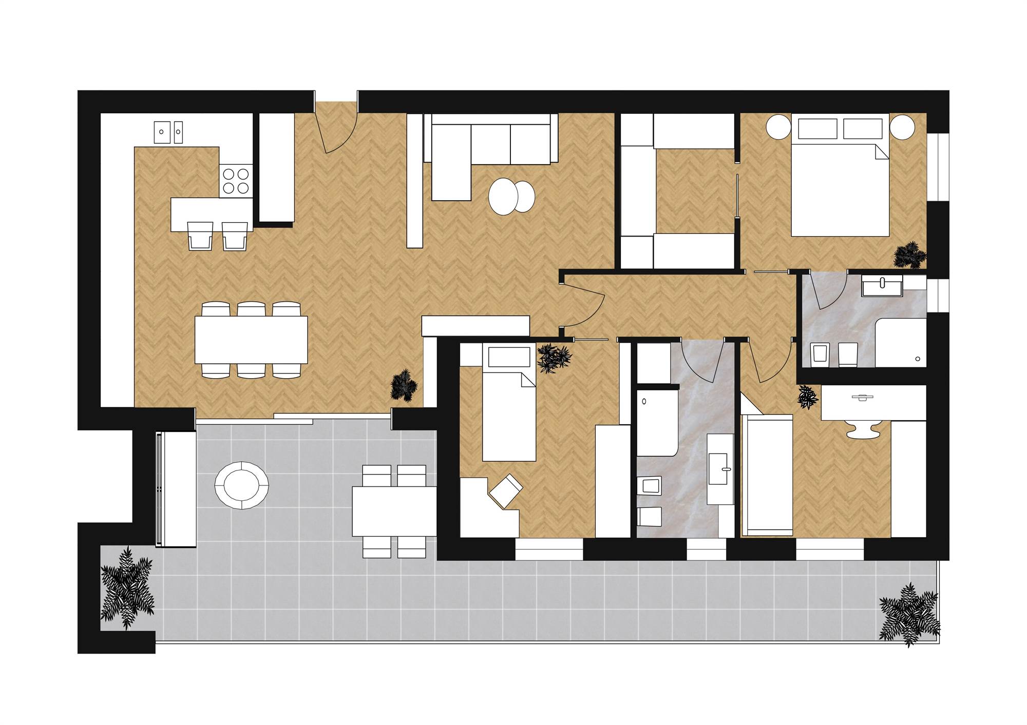 Ambiente open-space di oltre 40 mq. con possibilità di scelta della collocazione preferita per la zona cottura, confortevole terrazzo, zona notte composta da 3 camere da letto e 2 bagni. Possibilità di realizzare la cabina armadi ed il bagno in camera.