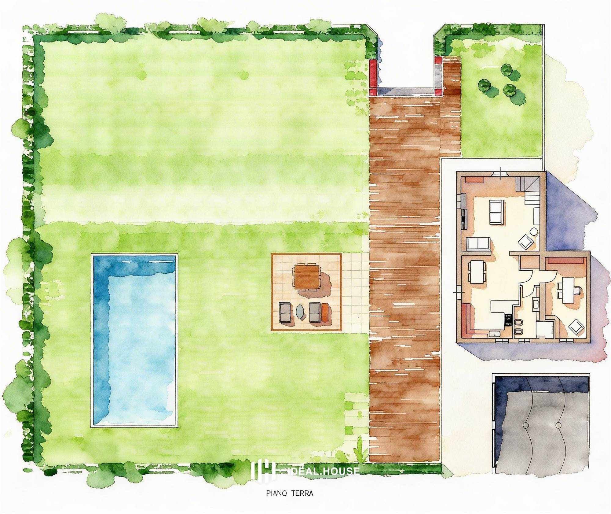 Il grande giardino, di circa 2000 mq. è ideale per godere momenti di svago all'aperto e per la futura realizzazione di una bellissima piscina.